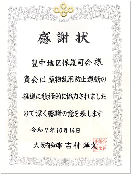 感謝状は豊中市更生保護サポートセンターに